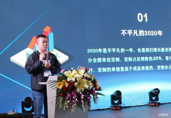 华灯璀璨的开场仪式,点燃了现场如火如荼的气氛。PA视讯集团营销总经理陈玉伟先生对晚会进行了主题发言,他对2020年的营销工作进行了总结,并着重从营销工作部署、重点项目开展、产品整合、拎包帮扶、渠道运营和移动+定制整装优势等方面对2021年的营销工作做了全面的统筹规划。同时,他还讲解了“美国梦凯莎床垫”新品的产品工艺、市场优势、产品定位,使经销商对我们的新产品拥有更深入的认识和了解。