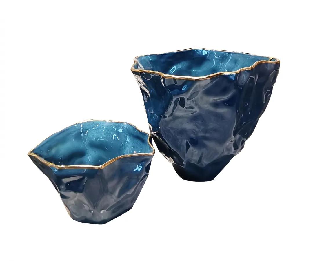 器口形状各异,摒弃了传统陶艺的方圆设计,引领中西结合陶艺的时尚特性,金边镶嵌,运用瓷器染色工艺,由深至浅洗染,以分明暗转折。