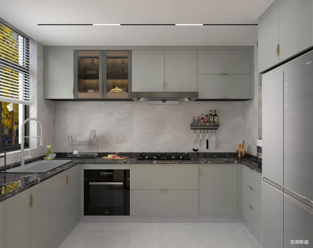 厨房定制设计多功能厨柜,搭配防滑地砖,从设计造型上摒弃传统橱柜的花哨装饰,色彩搭配简约时尚,人性化功能布局,既有收纳区,也有展示区,呈现出利落干净的秩序层次,满足空间的储物需求,也创造了空间规划与视觉美的双重展现。