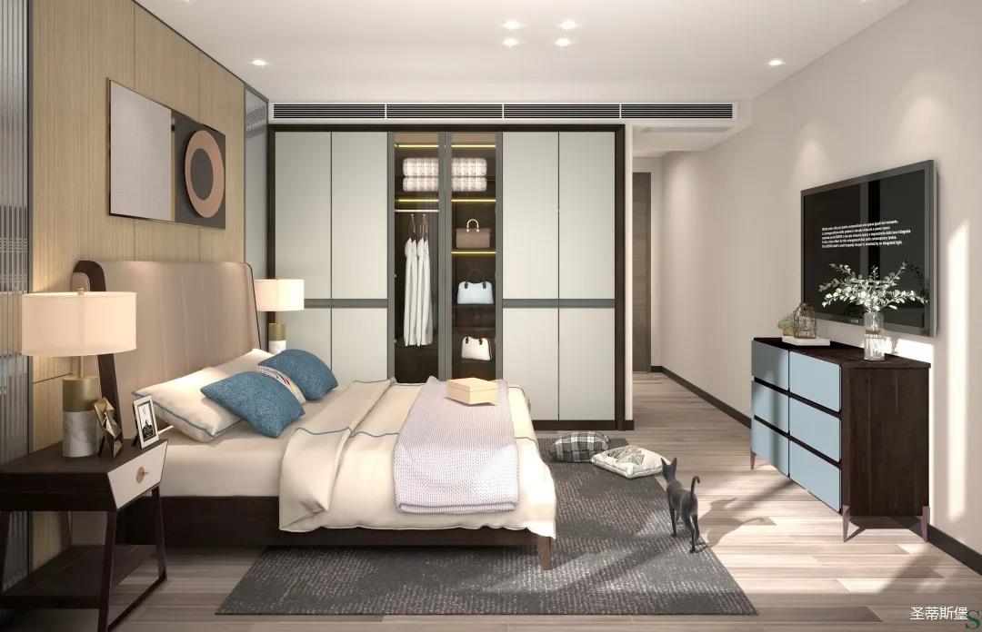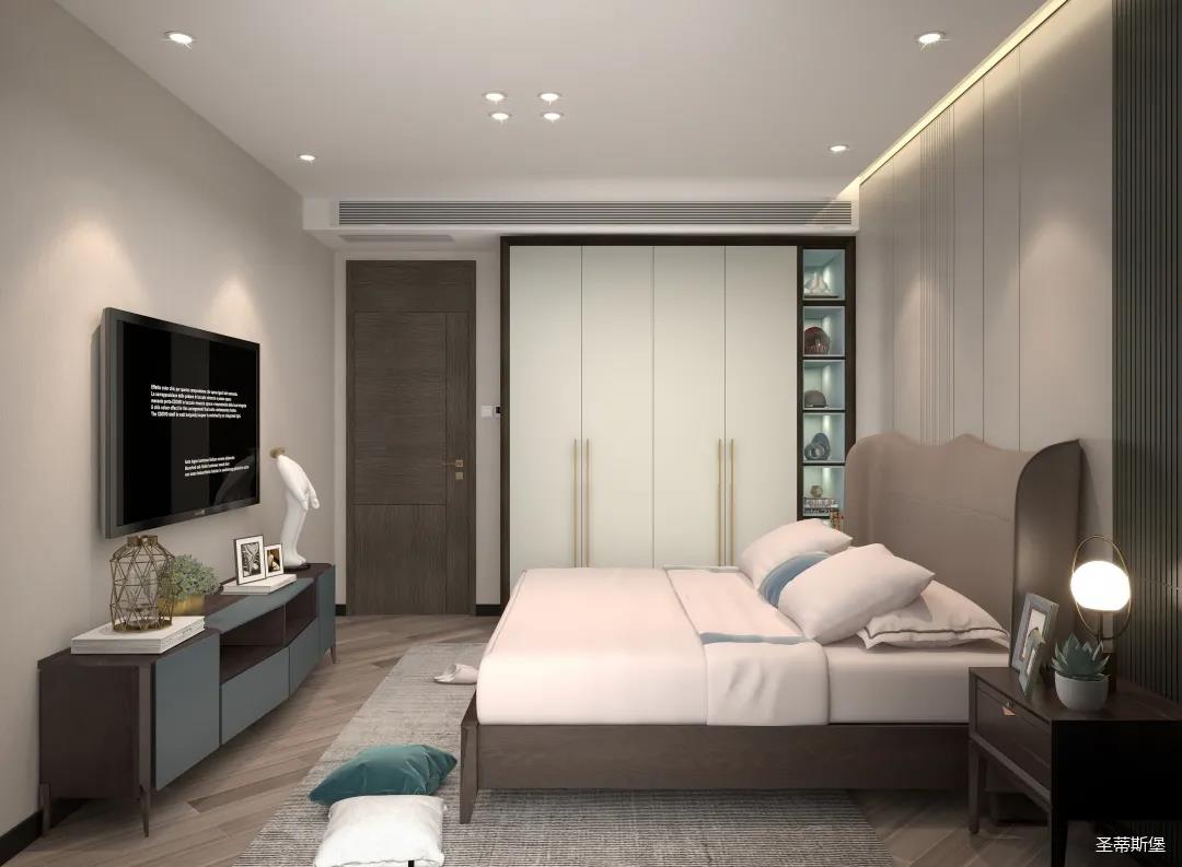 卧室主要的诉求是温馨、舒适、休闲。主卧在设计上将空间整体色彩饱和度降低,大都采用了米白、灰等浅系色调,材质从实木的基础上纳入少量的金属,让家具的整体造型简约精致,同时也为空间的通透感奠基。