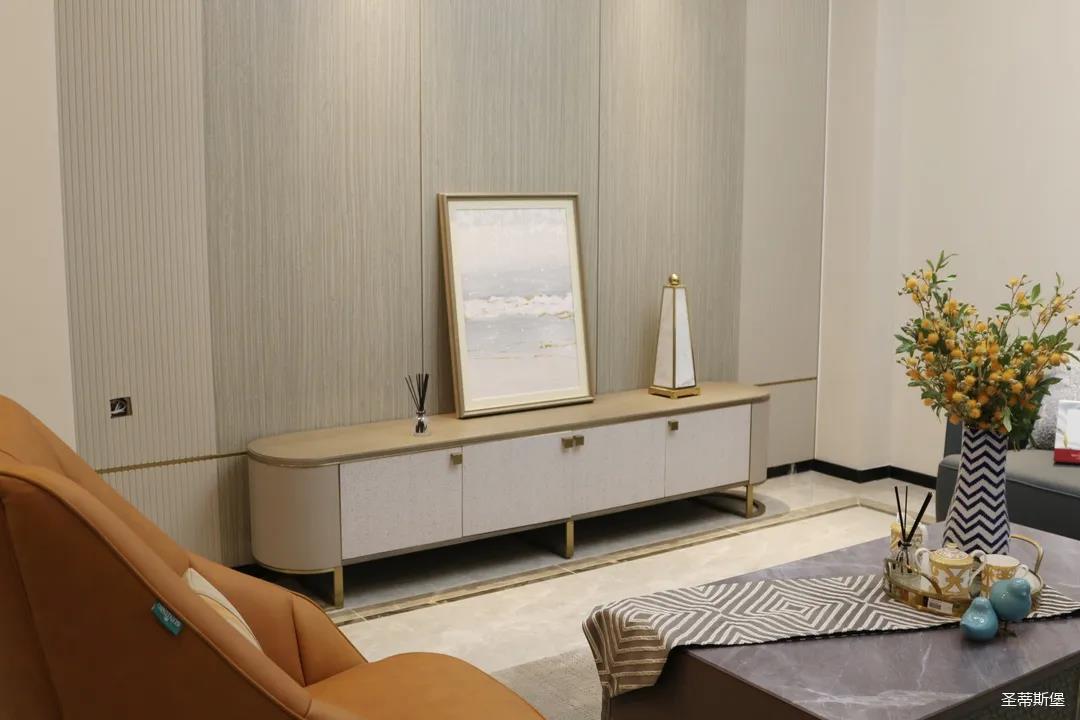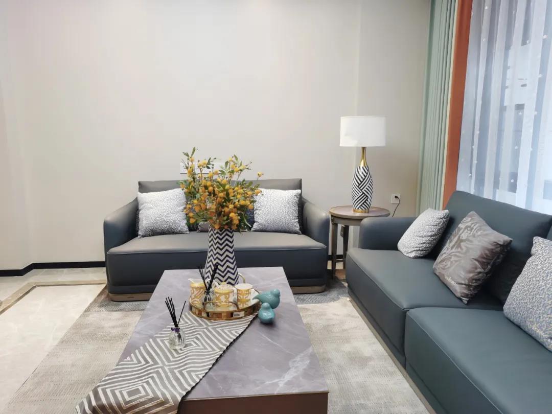 浅灰为基底的饰面与低饱和度的深色沙发相互映衬,产生强烈的视觉冲击,深色的家具让空间从视觉上衍生出一种纵深感。岩玻的质感与真皮编织的纹理尽显现代之美,细节陶瓷摆件注满了空间优雅的艺术氛围。