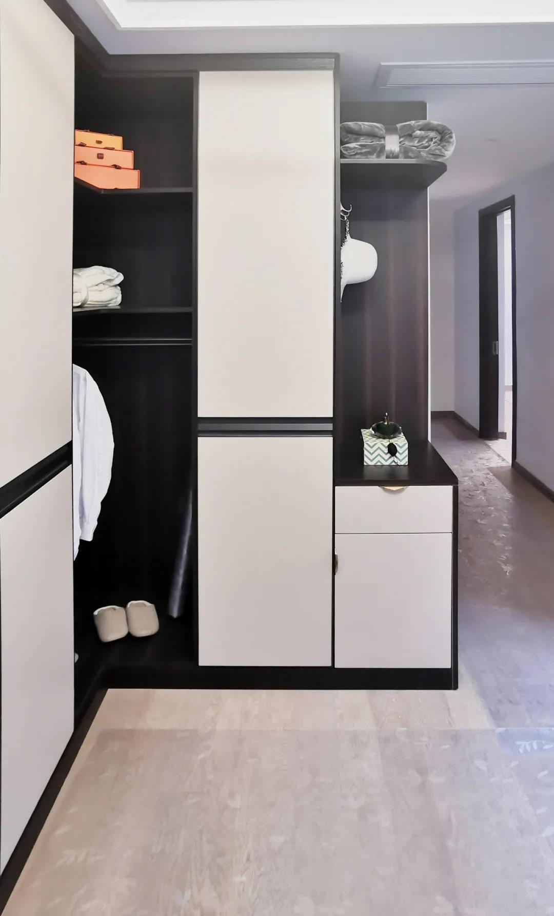 衣帽间以现代极简设计手法引入轻奢元素,借助实木与金属组合打破了传统储物区的沉闷感,烟熏色橡木纹的定制柜体,色泽好似一杯温暖醇香的摩卡,令空间层次感与立体感的格调顿生,予以沉稳舒适感官体验。
